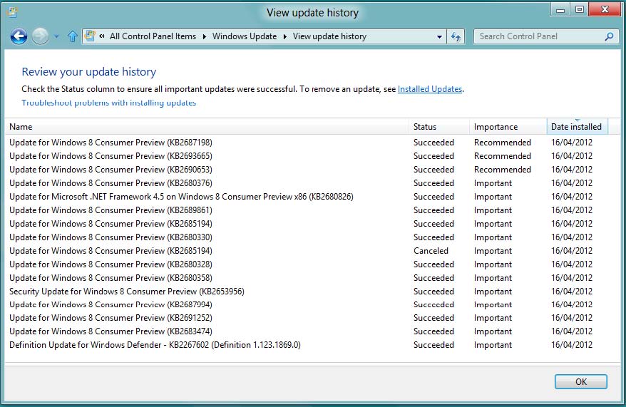 La ventana Ver Historial de actualizaciones muestra el historial del estado de sus actualizaciones. En la tabla se muestra el nombre de las actualizaciones en el campo Name, el campo Status muestra si la instalación ha sido completada Correcto (Succeeded), Cancelada (Canceled) o fallida (Failed). El campo Importancia muestra la importancia de la actualización instalada, y el campo Fecha de instalación muestra la fecha de instalación de las actualizaciones.