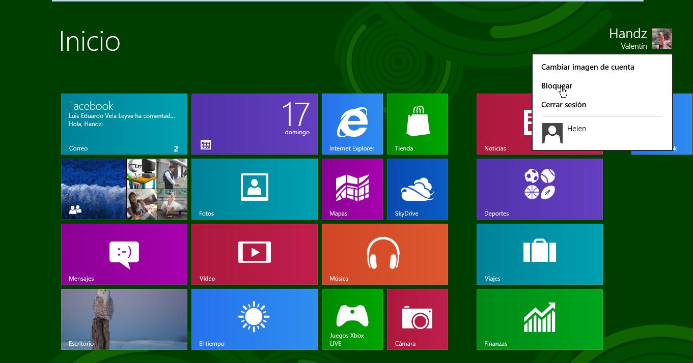 1° En el Pantalla Inicio, haga clic en el nombre de usuario de su cuenta y luego clic en Bloquear