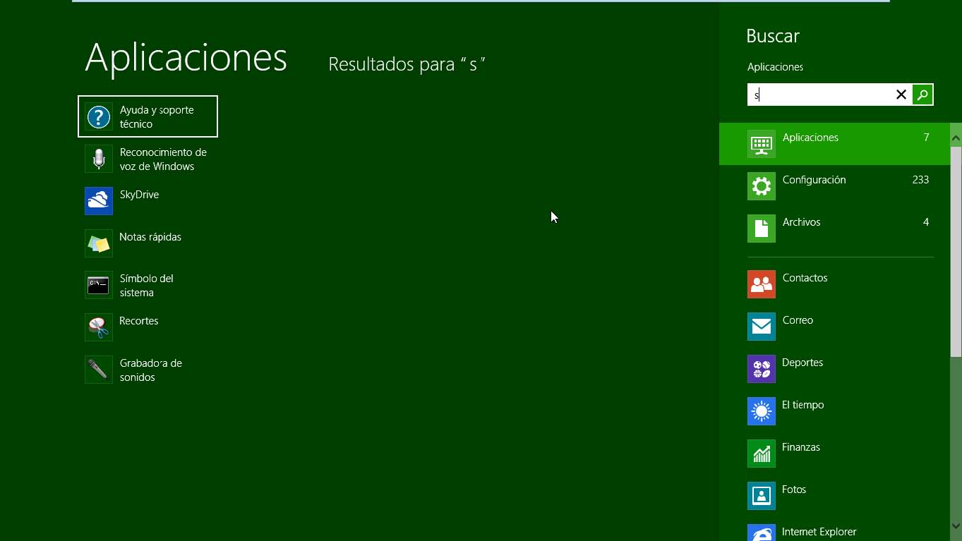 Para comenzar a buscar una aplicación que no se encuentra en los grupos de tiles de la Pantalla Inicio, puede fácilmente comenzar a escribir (no se preocupe dónde, solo escriba) todo o parte del nombre de alguna aplicación. Cuando lo haga, automáticamente se filtrará el nombre de la aplicación mostrando un pequeño ícono del mismo. A la derecha se encontrará un panel que indica que Windows 8 ha encontrado coincidencias de la palabra escrita para Aplicaciones, Configuraciones y Archivos. Debajo se mostrarán algunas aplicaciones recomendadas. Puede pulsar la tecla ESC para ir saliendo del filtro.