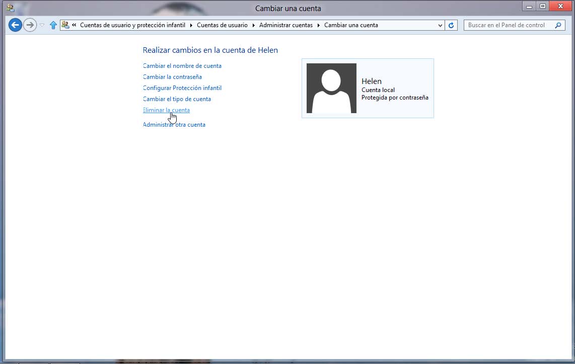 13° Dentro de la ventana Cambiar una cuenta, haga clic en Eliminar la cuenta.