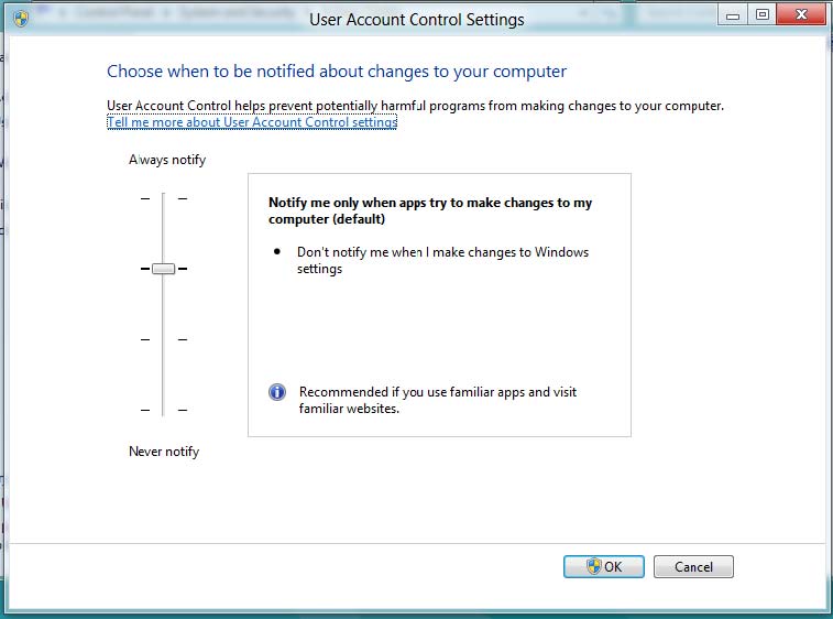 4° Haga clic en el botón deslizante y mueva hacia arriba o abajo para establecer el nivel UAC que usted quiera, y luego haga clic en Ok.