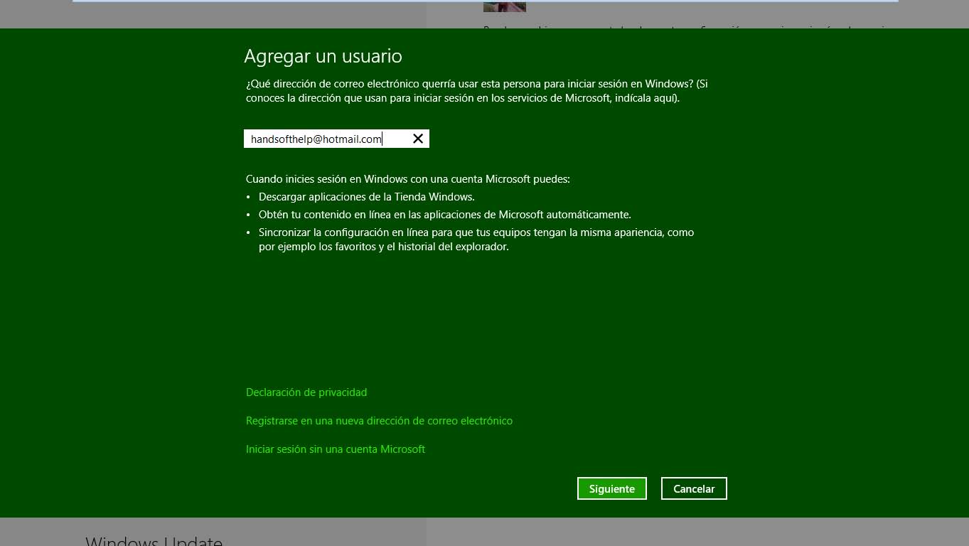 5° En el campo Dirección de correo electrónico escriba su cuenta de correo electrónico que esté asociada a algún servicio de Microsoft, como por ejemplo HOTMAIL.