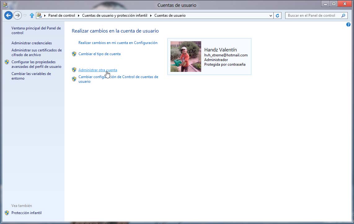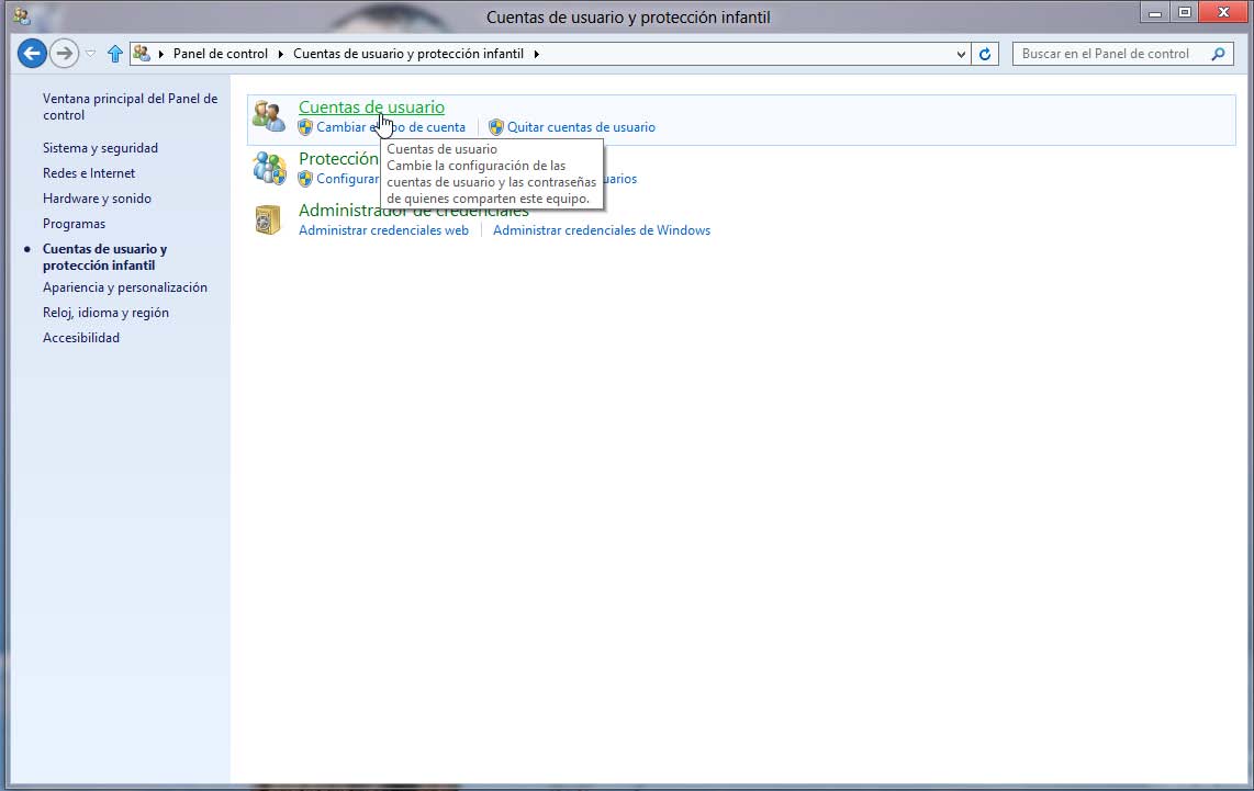2° En la ventana Cuentas de usuario y protección infantil, haga clic en Cuentas de usuario.