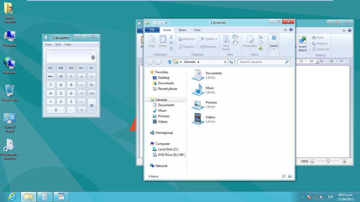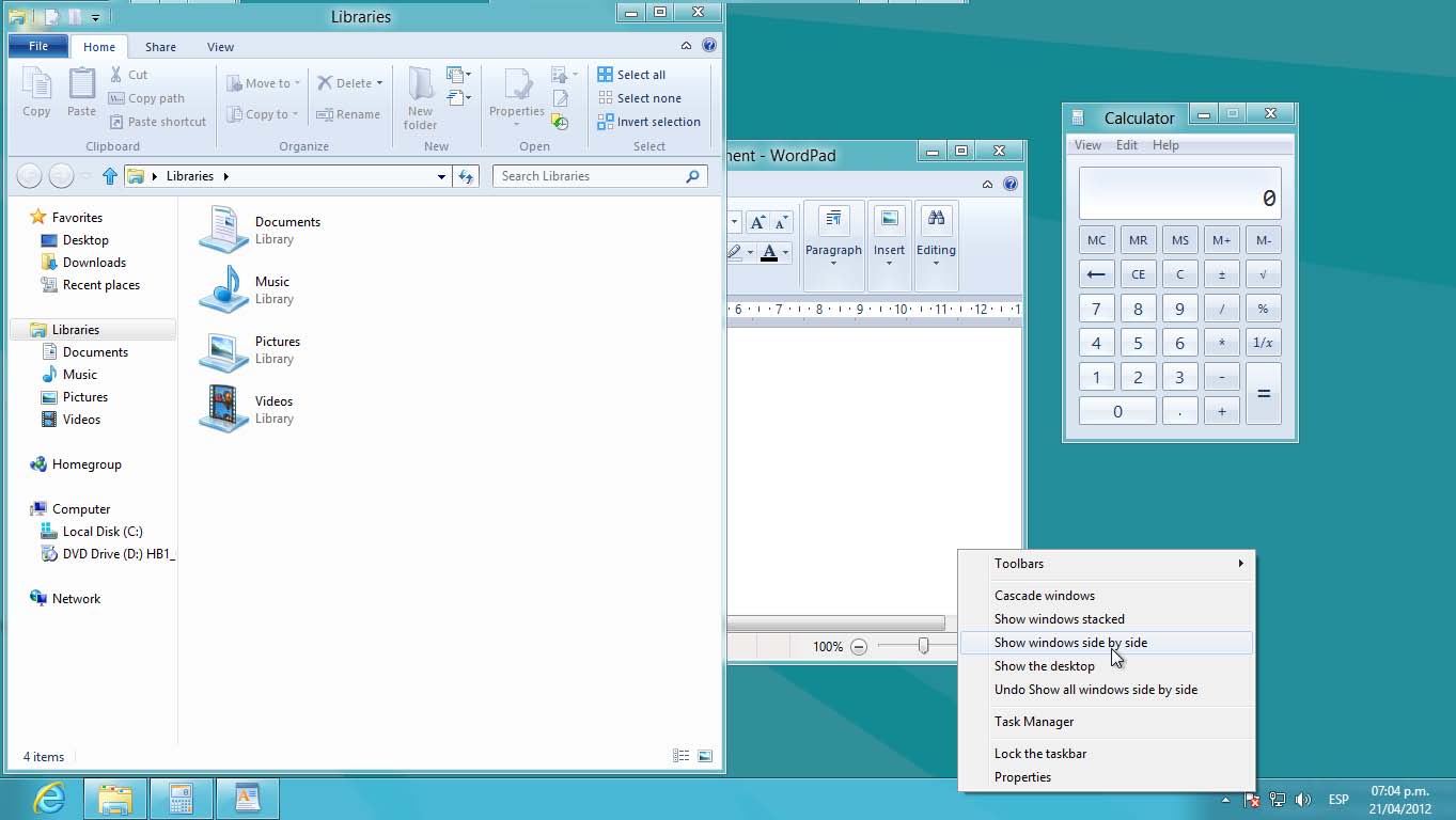 Se abre la ventana de Windows Explorer. Ahora ya tiene 3 ventanas clásicas abiertas en el escritorio de Windows 8. Observe también que en la barra de tareas se muestran los íconos de cada una de las ventanas. Por lo general cuando se abre una ventana siempre aparece en su tamaño original.