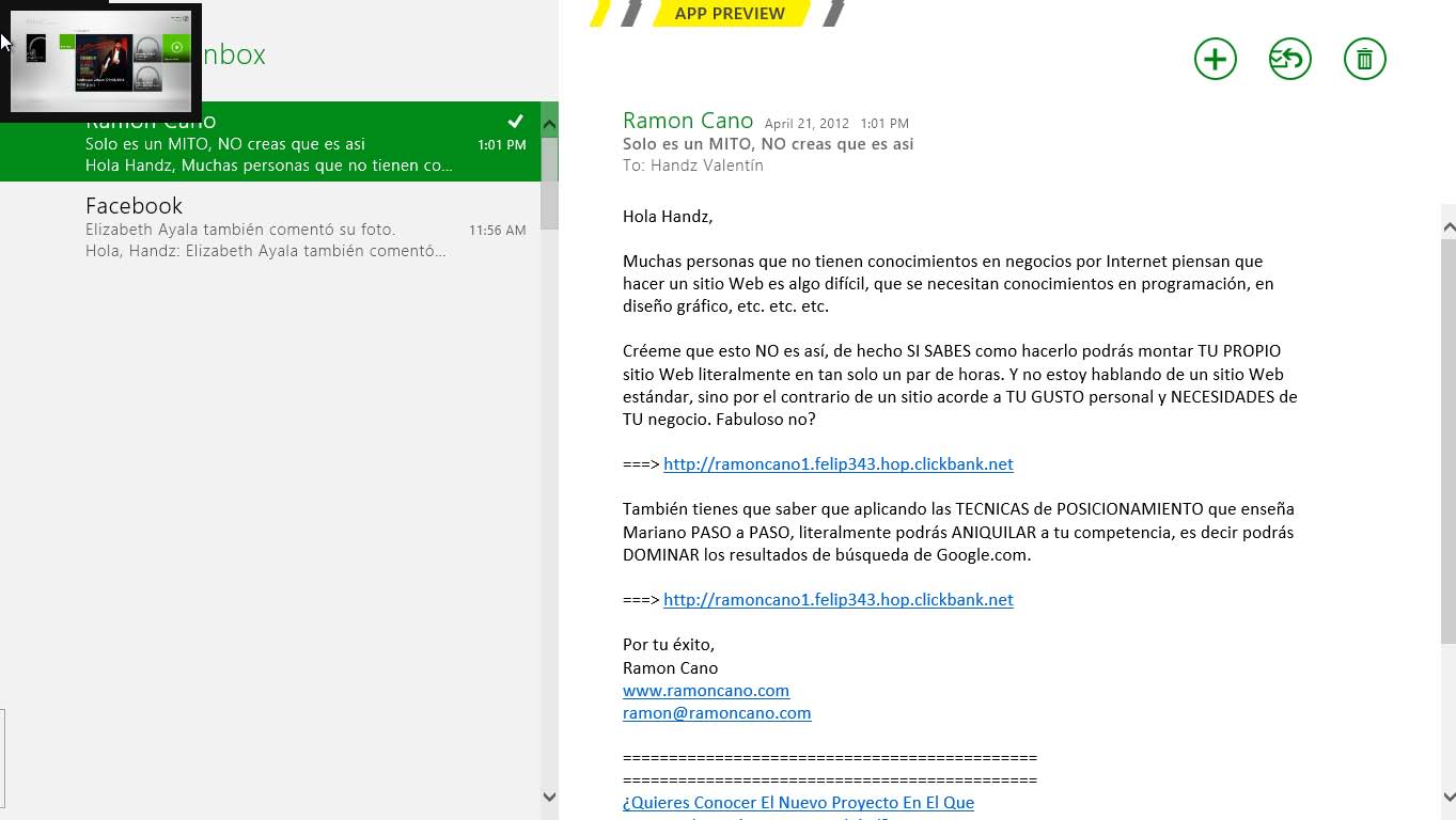 Si tiene varias ventanas de aplicaciones abiertas en Windows 8, puede intercambiar entre ellas de manera más sencilla. Basta con apuntar la esquina superior izquierda de la pantalla y Windows mostrará una miniatura de la otra ventana abierta. Si señala un poco más abajo podrá ver un panel que contiene todas las ventanas abiertas y también podrá ver la miniatura del Start Screen para acceder rápido a esa pantalla.