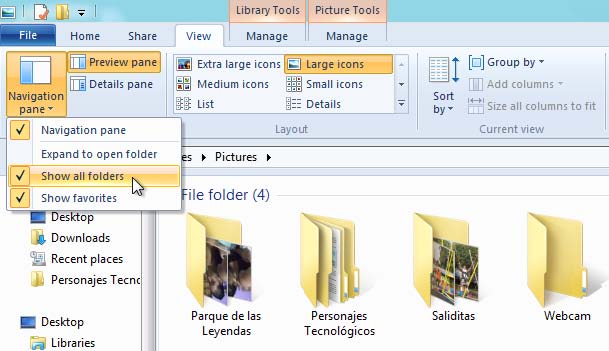 12° Haga clic nuevamente en Navigation pane del grupo Panes y clic en la opción Show all folders.