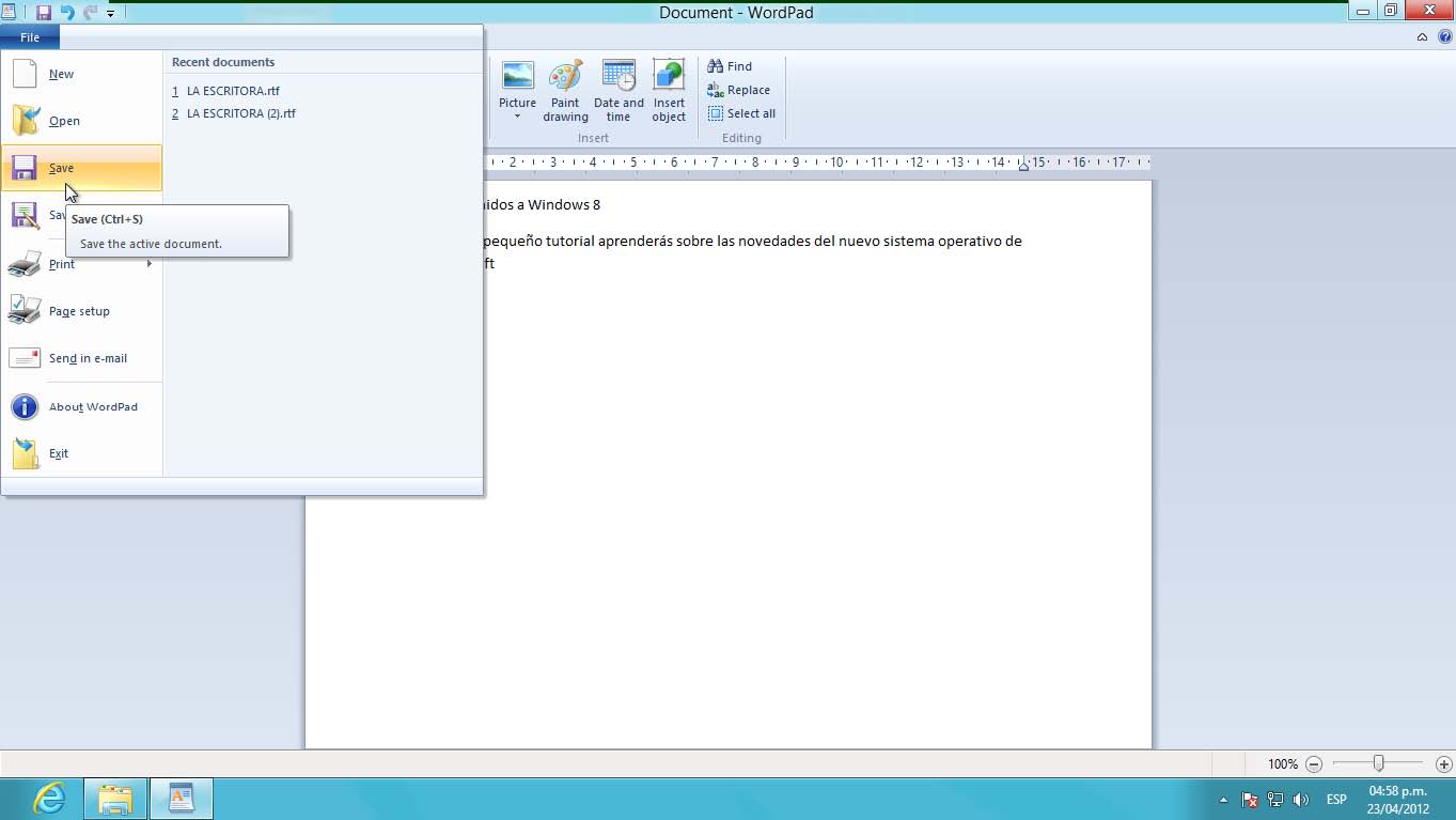2° En WordPad escriba Bienvenidos a Windows 8.