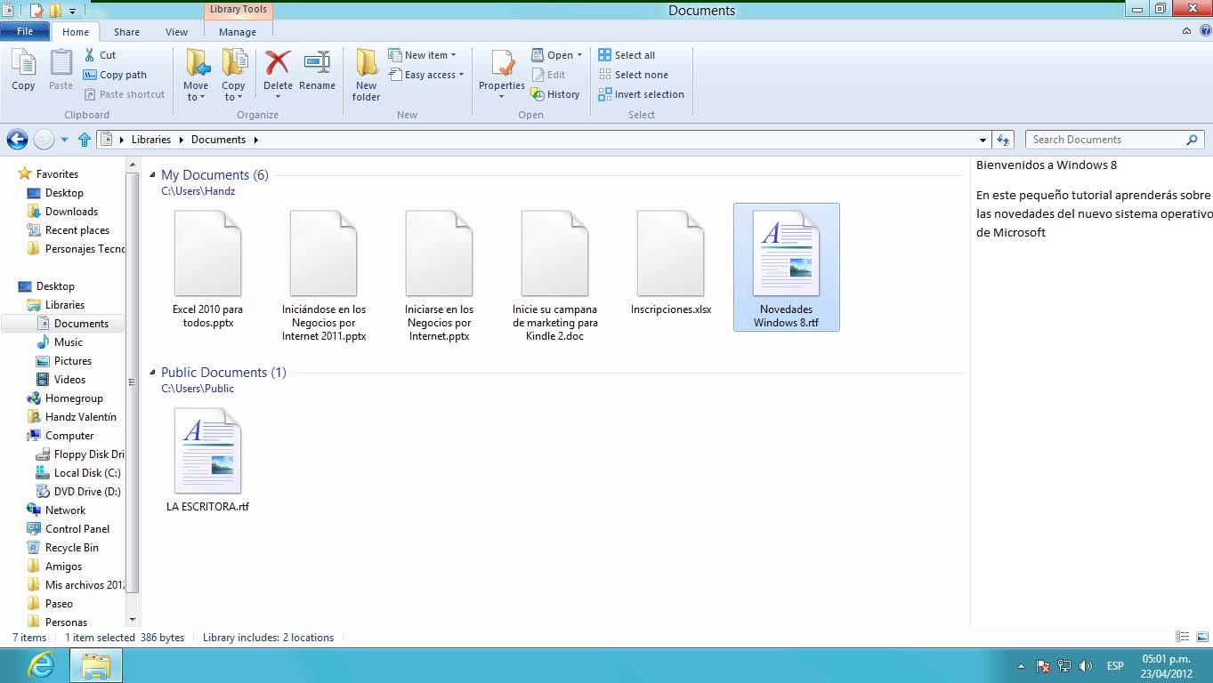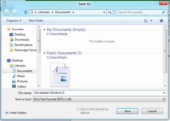 Ahora puede ver el archivo creado Novedades Windows 8.rtf.