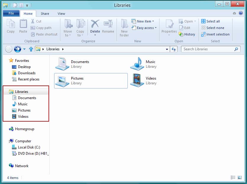 A la izquierda de la ventana, en el panel de navegación, se encuentra una lista de las bibliotecas que están en Windows 8.
