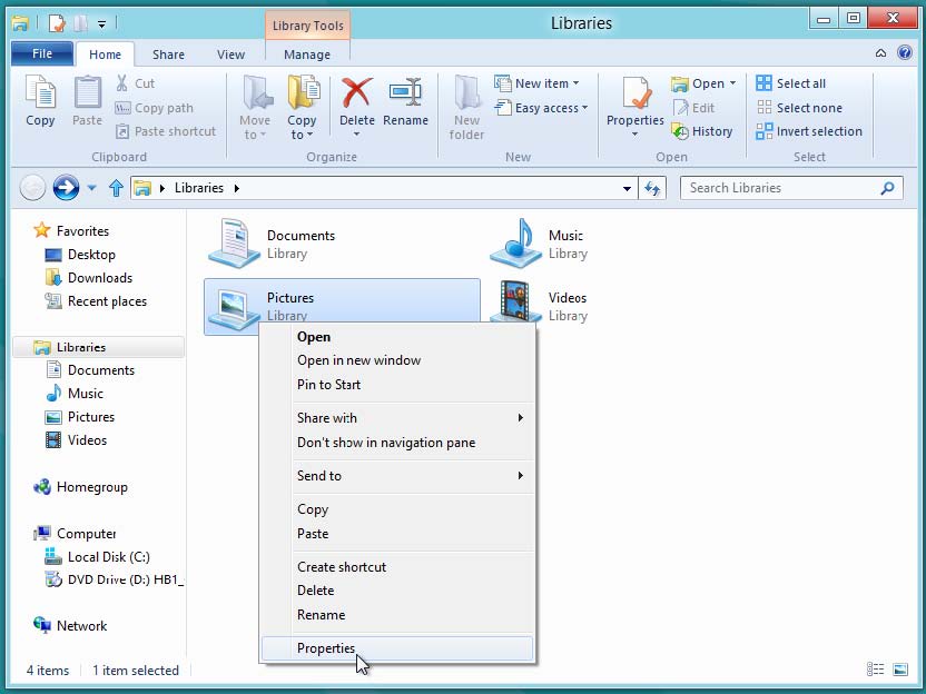 2° Haga clic derecho sobre la biblioteca Pictures y haga clic en Properties.