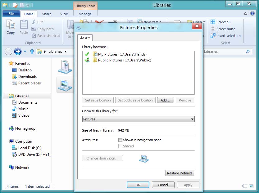 Observe el panel de navegación. Como puede ver, ahora no se muestra la biblioteca Pictures en la lista de directorios.