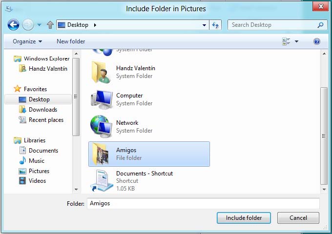 7° En el panel de navegación haga clic en Desktop (Escritorio) y en el panel de contenido, haga clic en la carpeta Amigos para seleccionarlo y luego clic en el botón Include folder.