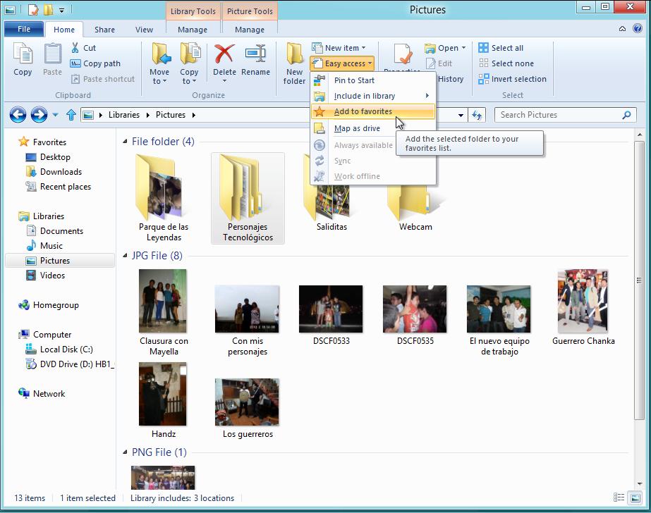 14° Seleccione su carpeta Personajes tecnológicos y en el grupo New haga clic en Easy Access, y dentro de la lista haga clic en Add to favorites.