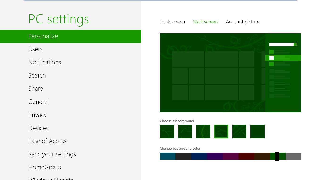 4° En la sección Choose a background haga clic en cualquiera de las miniaturas de fondos y observe como va cambiando el fondo del Start Screen en la pantalla de previsualización.