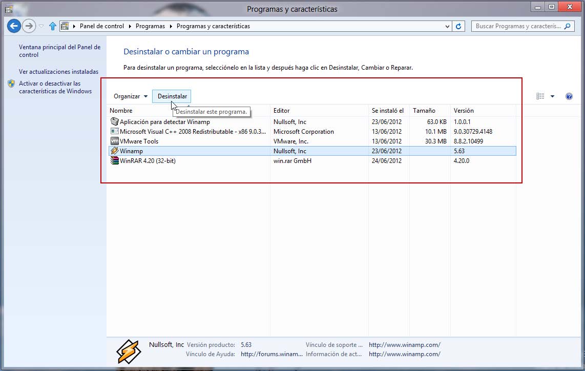 Observe que en esta tabla de programas se muestra al empresa que la creó, la fecha de instalación, el tamaño de archivo y su versión.