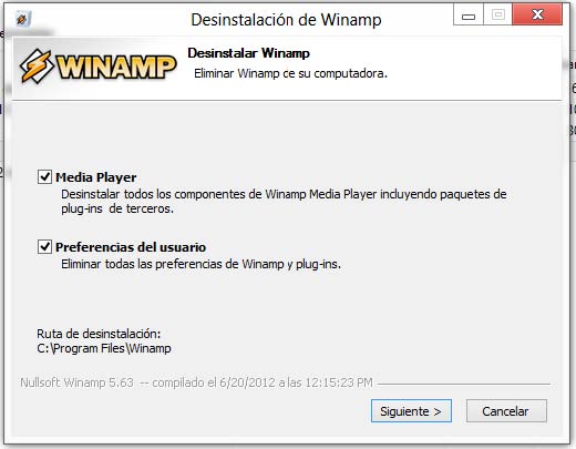 En este caso, nos aparece el asistente para la desinstalación de Winamp. En esta ventana nos indica si queremos borrar todas las características que fueron incluidas cuando instaló Winamp. En ocasiones un programa como un reproductor y gestor de músicas al igual que Winamp instalan plug-ins para la reproducción de ciertos tipos de archivos, por lo tanto, al desinstalar Winamp por completo, estos plug-ins de eliminarán y si otro programa los estaba usando (otro reproductor), entonces los archivos que antes funcionaban con otro reproductor dejarán de reproducirse.