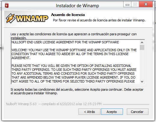 La siguiente ventana nos muestra las condiciones de la licencia del programa. Se debería leer por completo el texto incluido en esta ventana para saber lo que instalamos. Una vez hecho esto ya podemos aceptar la ventana.