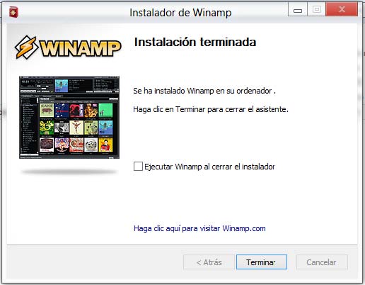 Una vez instalado el programa, puedes dejar que el programa se ejecute una vez hecho clic en el botón Terminar o desactivar la opción ejecutar Winamp al cerrar el instalador para terminar la instalación y Winamp se ejecute cuando usted lo decida.