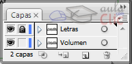 Lo primero es duplicar el efecto para simular el volumen. Esto lo haremos duplicando la capa, seleccionando la capa en el panel Capas, y eligiendo Duplicar "capa" en el menú. Desplazaremos la nueva capa debajo y la renombraremos. Como sólo vamos a manipular la capa del volumen, es mejor bloquear la capa con las letras para no poder modificarla.