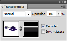 Para hacer que el reflejo se vaya diluyendo, utilizamos una máscara de opacidad, haciendo doble clic junto a la miniatura del grupo en el panel Transparencia. En la máscara de opacidad, creamos un rectángulo que abarque todo el reflejo, y lo rellenamos con un degradado, con la parte superior blanca y la inferior negra.