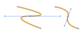 En la imagen vemos dos trazados con tres pontos de ancla a la misma distancia. Lo único que se ha modificado es el ángulo y el tamaño de las líneas de dirección.