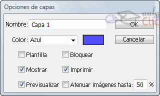 Otra cuestión a tener en cuenta es si queremos imprimir toda la ilustración o sólo algunas partes. Con las opciones por defecto, las capas no visibles de la ilustración no se imprimen. Si queremos que una capa, aunque si sea visible, no se imprima, podemos desmarcar la opción Imprimir de su ventana de opciones, a la que accedemos al hacer doble clic sobre la capa.