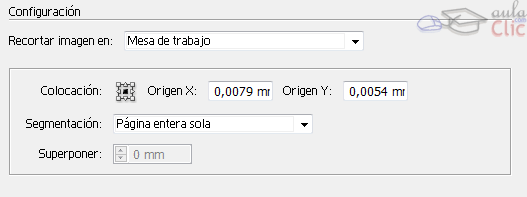Lo primero que hay que ajustar es qué queremos imprimir, en el desplegabe Recortar imagen en:. Por defecto, está seleccionada la Mesa de trabajo, pero podemos seleccionar el Cuadro delimitador de la ilustración o Aréa de recorte. En caso de seleccionar está última opción, debemos de haber creado el área de recorte antes de acceder a las opciones de impresión.