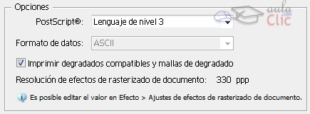 Si nos sucede esto, podemos hacer que Illustrator rasterice estos elementos antes de imprimirlos. Para hacerlo, desde la ventana Imprimir, en la sección Gráficos hay que marcar la opción Imprimir degradados compatibles y mallas de degradado.