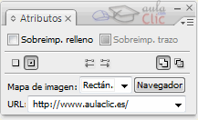 Aunque el resultado sea una única imagen, nosotros trabajaremos con distintos objetos, cada uno de los cuales puede tener un enlace. Para crear un enlace en un objeto, lo seleccionamos e introducimos la dirección en el campo URL del panel Atributos. En Mapa de imagen, seleccionamos si la zona del enlace será un rectángulo o un polígono. Illustrator ajustará lo que elijamos a la forma del objeto.