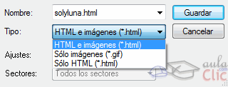 La información de qué zonas tienen enlace y a dónde no se guarda en el archivo de imagen. Estos datos se introducen con la etiqueta map en el html de la página. Al Guardar para web y dispositivos, tras elegir el formato, pasamos al diálogo donde establecemos la ubicación del archivo. Ahí, en tipo podemos elegir si generamos sólo la imagen o también el una página con el código necesario para generar el mapa. Podemos copiar ése código en nuestra web.