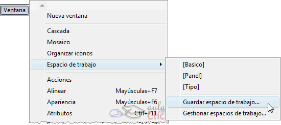 Todo esto nos ha servido para crear un espacio de trabajo personalizado. Lo normal es utilizar distintos espacios de trabajo dependiendo del tipo de documento y lo que queramos hacer con él, ya que utilizaremos distintas opciones. Por eso, para no tener que personalizarlo cada vez, podemos guardarlo desde el menú Ventana → Espacio de trabajo → Guardar espacio de trabajo....