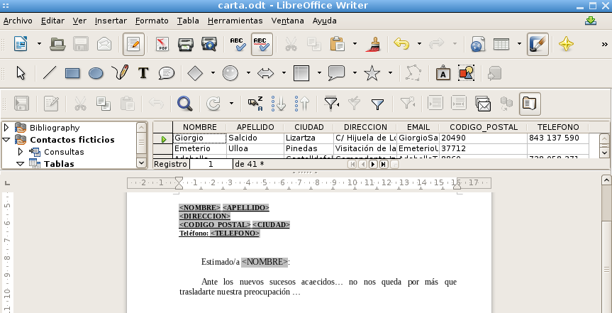 carta modelo, LibreOffice detecta que hay campos en la carta y pregunta si