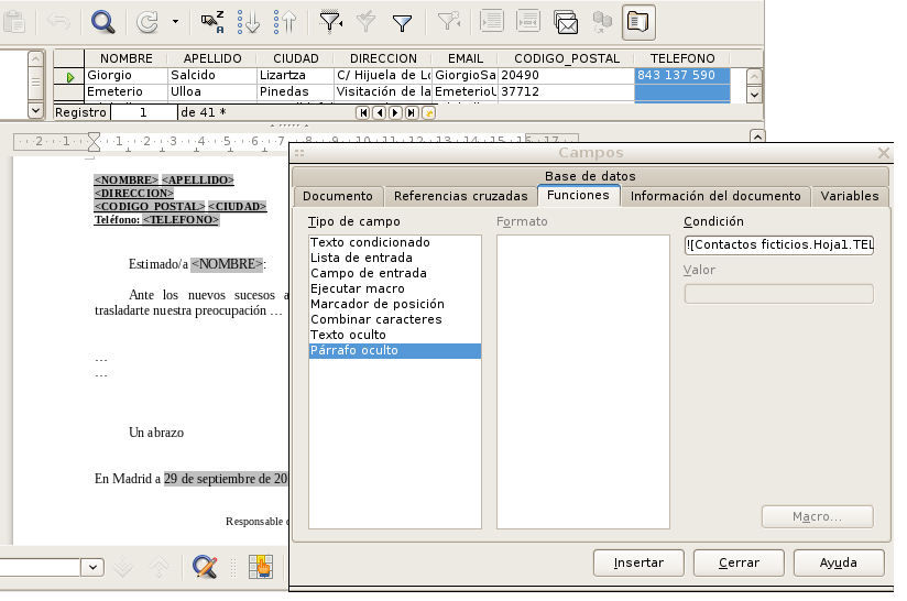 • El documento está casi listo para ser imprimido. Sin embargo antes de hacerlo vamos a añadir un retoque más, ya que como se puede observar en la imagen anterior, ¿Qué ocurrirá cuando LibreOffice genere la carta para el segundo registro, el que corresponde a Emeterio? Al no tener teléfono, La carta aparecería con la palabra “Teléfono: “ y a la derecha nada porque esta persona no tiene esa información en la base de datos. Podemos hacer que LibreOffice no imprima un párrafo si alguno de los campos que hemos añadido antes al documento, no tiene información en la fuente de datos. Para ello se ha de introducir una condición de la siguiente forma: