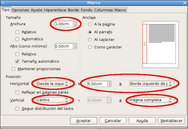 • En la ventana Marco > pestaña Tipo,
