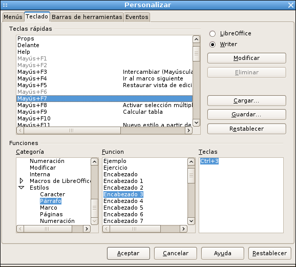 Para asignar un estilo, la categoría debe ser Estilos, y la función, el estilo en concreto. En la imagen anterior se ha seleccionado el estilo Encabezado; como puede verse el estilo actualmente está asignado a la combinación Ctrl+3. Para asignarlo a Mayús+F7 primero debemos eliminarlo de Ctrl+3, seleccionaremos la tecla rápida Mayús+F7, y luego haremos clic sobre “Eliminar” y finalmente a Aceptar.