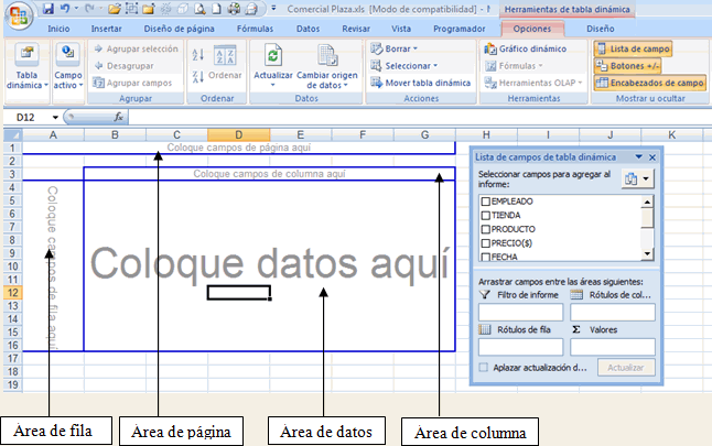 Las siguientes figuras muestran la secuencia de acciones necesarias para construir una tabla dinámica. El archivo a ser usado es Comercial plaza.xlsx.