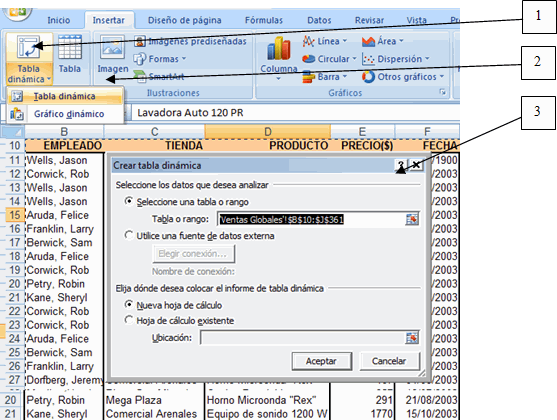 Como se aprecia en (1), se debe hacer clic en la <Tabla dinámica> de la ficha <Insertar>. El cursor debe estar dentro de los datos a fin de disponer del rango ya seleccionado como se muestra en (3). En esta ventana se debe decidir si la tabla se desea en una nueva hoja o en la hoja donde están los datos. Luego de hacer clic en <Aceptar> se obtiene la siguiente ventana: