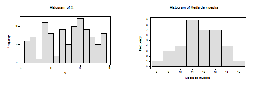 Finalmente, la siguiente figura contiene la gráfica de histogramas de los datos poblacionales y la gráfica de las medias muestrales.