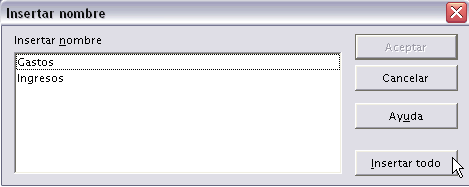 | Cuando asignamos nombres a diversas celdas, las fórmulas que hagan referencia a estas celdas no se cambian automáticamente sustituyendo la nomenclatura de columna-fila por el nombre. Por ejemplo: Si tenemos la fórmula =A1+B1 y posteriormente asociamos la celda A1 con el nombre Gasto1 y la celda B1 con el nombre Gasto2. En la fórmula continuará saliendo =A1+B1. Para que los nombres se actualicen en todas las referencias debemos ir a la barra de menús, a Insertar -> Nombres y Insertar.... En el cuadro de diálogo Insertar nombre que nos aparece debemos seleccionar los nombres que queramos aplicar y hacemos clic en Aceptar.