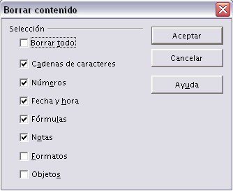 Seleccionar la celda a borrar. Pulsar la tecla SUPR o acceder por el menú Editar - Borrar contenido... Con esta opción únicamente se borrará el contenido de la celda. Aparece el cuadro de diálogo que vemos en la imagen de la derecha donde podemos seleccionar que es lo que queremos eliminar. |
