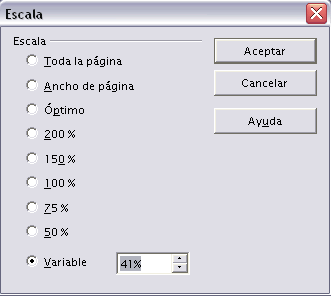 Para aplicar el zoom a las diapositivas sitúate primero en la diapositiva sobre la cual quieres que se aplique el zoom y después despliega el menú Ver y selecciona la opción Escala.... Aparece un cuadro de diálogo como el que vemos a la derecha dónde podemos seleccionar una escala predeterminada, o bien escoger una variable. Pulsamos Aceptar para que se aplique. |