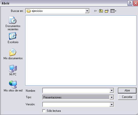 En la lista desplegable del cuadro Buscar en seleccionamos la unidad en la cual se encuentra la presentación que queremos abrir, a continuación seleccionamos la carpeta que contiene la presentación. Una vez hayamos seleccionado la presentación pulsamos en el botón Abrir.