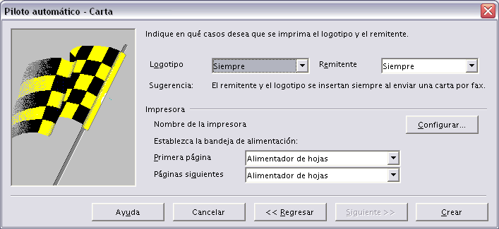 Y esta es la última pantalla donde debemos indicar cuando deseamos que se imprima el logotipo y el remitente. También podemos configurar la impresora pulsando sobre el botón Configurar... Para terminar pulsaremos sobre Crear para que termine de crear la plantilla que hemos formado. |