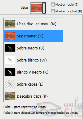 Lo primero que encontramos es el Modo de vista: básicamente nos permite elegir distintas formas entra las que comparemos el área seleccionada y el resto. Por ejemplo, nos resultará más sencillo realizar correcciones si podemos ver la imagen, pero nos quedará más claro si los detalles están seleccionados si lo vemos más contrastado, usando Blanco y negro. Si vemos la selección con la Línea discontinua en movimiento puede parecer que los detalles pequeños no están seleccionados, pero podemos comprobar que sí lo están al ver la imagen Sobre blanco.