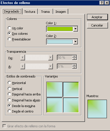 Lo primero que tienes que hacer para aplicar un degrado es seleccionar el color o los colores con los que quieres trabajar. Si quieres trabajar con uno sólo activa la casilla Un Color y después en color 1: elige el color que te guste. Si quieres trabajar con 2 colores activa la casilla Dos Colores y después elige el color 1: y el color 2:. Una vez seleccionados los colores puedes indicar la dirección del degradado a través de Estilos de sombreado, en la parte de la derecha podrás ver cómo quedará al aplicarlo en una tabla. Cuando hayas elegido los efectos de relleno que más te gusten pulsa Aceptar. |