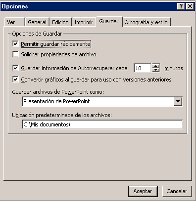 quieres que guarde el archivo. En esta pestaña también muy útil es la Ubicación predeterminada de los archivos. Ahí ponemos el nombre de la carpeta donde guarda por defecto los archivos, es la carpeta que aparece en el cuadro Guardar en de la ventana Guardar como. |