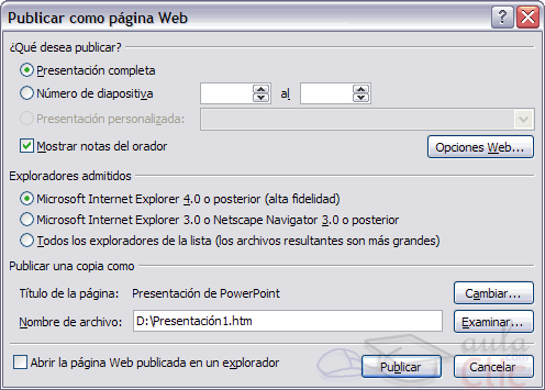 En esta ventana podemos elegir qué partes de la presentación queremos publicar (la presentación completa o bien un rango de diapositivas, por ejemplo de la 5 a la 10).