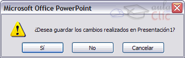 2 Si te aparece un cuadro de diálogo como el que te mostramos a continuación pulsa en el botón Sí para guardar los cambios de la presentación que has creado con el nombre que tu quieras, No para no guardar cambios y cerrar PowerPoint y Cancelar para volver a la ventana que estabas anteriormente, sin cerrar ni guardar.