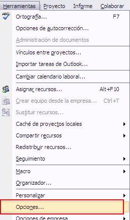 Para configurar Project a nuestras necesidades debemos abrir el cuadro de diálogo Opciones que se encuentra dentro del menú Herramientas.
