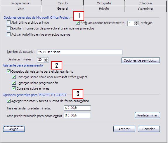 1* Opciones generales de Microsoft Office Project.